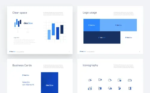 The blue tones were carefully selected to complement the other elements of the brand identity, including the logo, illustrations, and custom icons, to create a cohesive and recognizable brand image for Dex.blue.