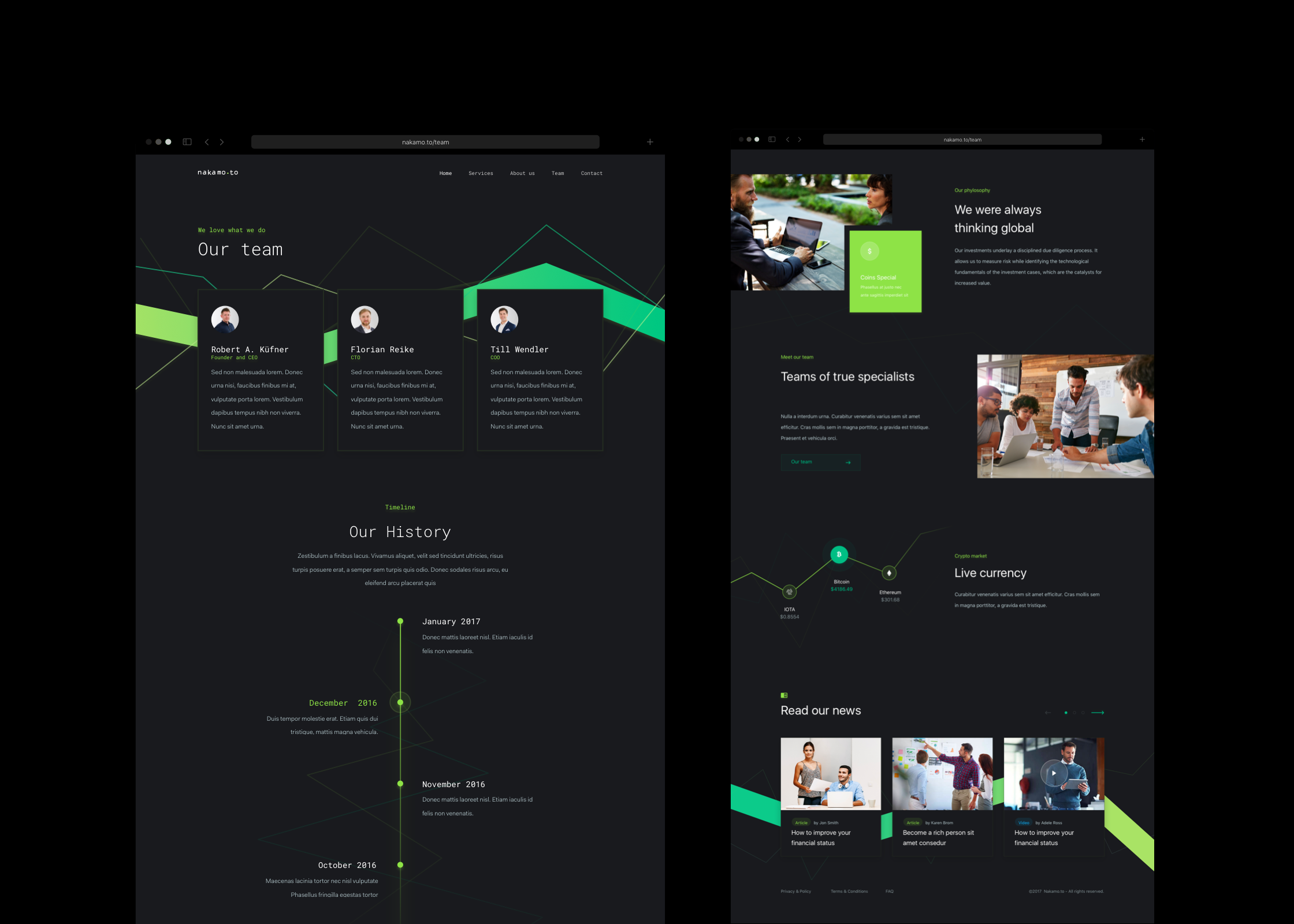 Finwerk Creative Agency developed branding guidelines and a corporate identity for nakamo.to to ensure a consistent look and feel across all of the company's marketing materials and customer touchpoints. The guidelines included the use of green gradients, referencing typical CLIs and IDEs, which is meant to reference the software development nature of the client. These guidelines ensured a cohesive and memorable look for the nakamo.to brand.
